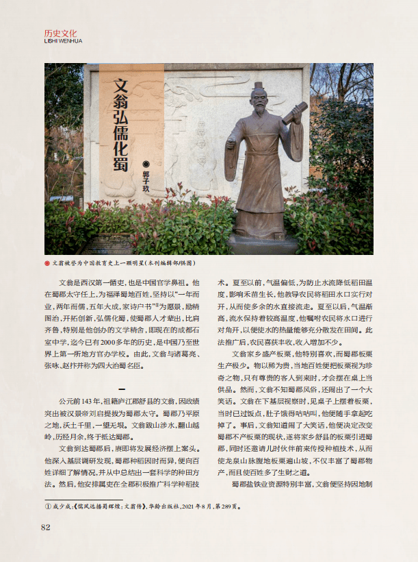 “历史文化”栏目,刊发《文翁弘儒化蜀》《名酒江口醇 滴滴都是情》两篇文章,前文围绕“仁爱、廉平、勤政、创新”等核心思想,再现了西汉太守文翁的成长历程,重点梳理了文翁在任太守时兴修都江堰、发展农村经济、创办石室、盐铁业改革等伟业,展示了太守修身齐家治蜀的可歌可泣的事迹,有意识地厚植了仁爱、廉平、创新、勤政等时代精神;后文讲述江口醇酒业的创业、发展历史,展示在川酒振兴的大背景之下,江口醇担起川东北特色白酒产区发展重任,在平昌工业振兴中扮演着重要角色。