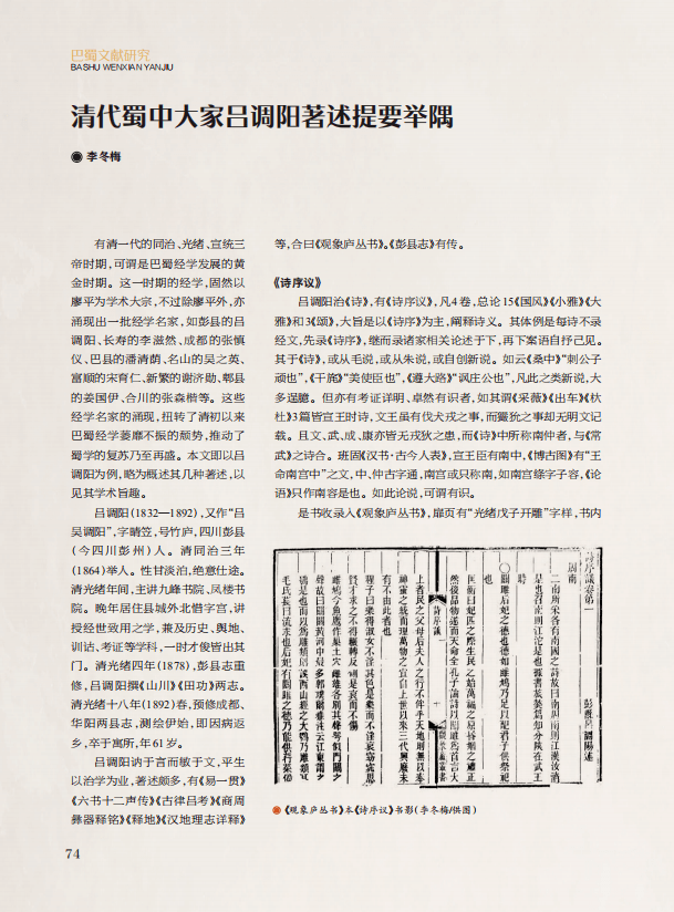 “巴蜀文献研究”栏目,刊发了三篇文章,分别是《巴蜀地区简牍文献概述》、《清代蜀中大家吕调阳著述提要举隅》和《元代蜀人别集两种整理前言》。这些文章的作者均为四川大学古籍整理研究所的专家,他们从学术的深度和历史的维度出发,对巴蜀地区近些年来出土的简牍类文献进行了简要整理和介绍;以吕调阳为例,介绍了其著述的思想地位与影响;对元代蜀人蒲道源的《闲居丛稿》、任士林的《松乡先生文集》两部别集作了整理和介绍,有利于了解别集主人的生平事迹和文学思想。文章研究深入、史料丰富,为引导读者领略巴蜀文化的博大精深、关注巴蜀文献的整理研究起到积极推动作用。
