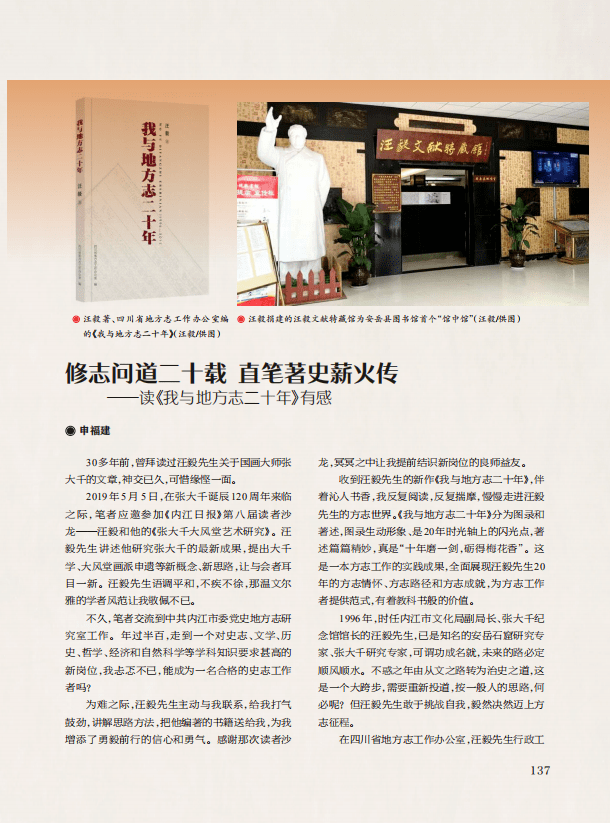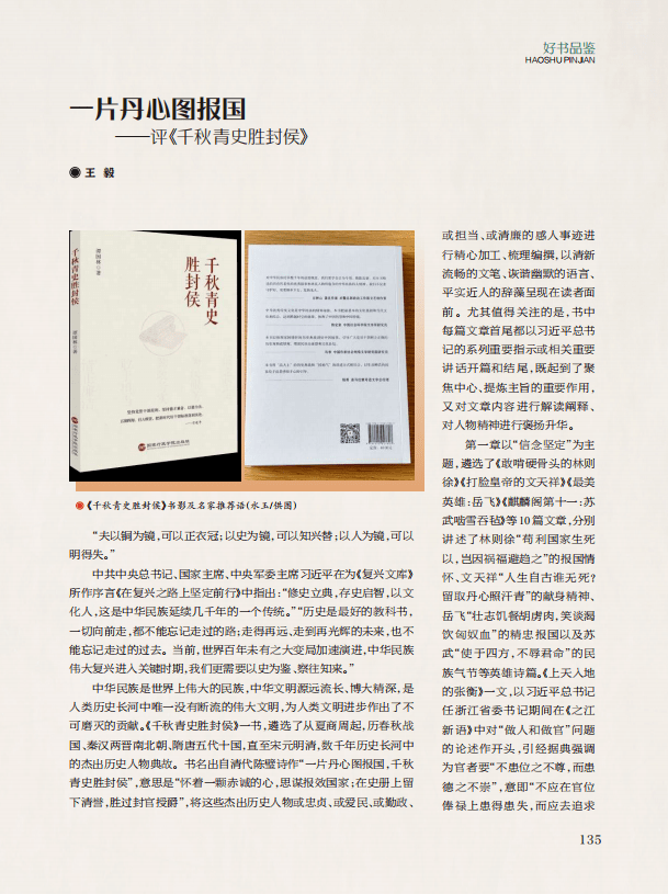 “好书品鉴”栏目,刊发《一片丹心图报国——评〈千秋青史胜封侯〉》《修志问道二十载 直笔著史薪火传——读〈我与地方志二十年〉有感》两篇文章。前文介绍《千秋青史胜封侯》一书以新时代好干部标准为标杆,从信念坚定、为民服务、勤政务实、敢于担当、清正廉洁5个方面,精选出60个我国古代明君贤臣的经典历史故事,将历史典故和时代信奉结合,阐发中华优秀传统文化蕴含的治国理政智慧,激励广大干部以史为鉴,砥砺品格,践行新时代好干部标准,在新征程再建新功;后文介绍《我与地方志二十年》作者从事地方志工作20年的历程,展示了其修志格局和方志文化视野,探讨了此书的价值作用及影响。