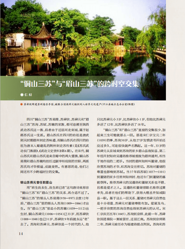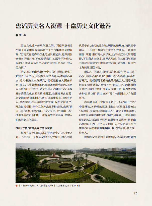 “封面故事”栏目,以“铜山三苏”苏易简、苏舜钦、苏舜元为记述内容,刊发《“铜山三苏”与“眉山三苏”的跨时空交集》《宋初状元苏易简确为中江人》《盘活历史名人资源 丰富历史文化滋养》3篇文章,通过探究“铜山三苏”与“眉山三苏”的跨时空交集、考证苏易简生平事迹,认为“铜山三苏”历史文化名人是极其珍贵的文化资源和精神财富,提出要在深挖考古发现、历史遗址遗迹的同时,采取申报四川历史名人、举办学术论坛、梳理文物资源、保护文化遗产、开发影视项目、制作文创产品等多种途径,盘活历史名人资源,弘扬“铜山三苏”文化,将“铜山三苏”打造成中江乃至四川一张靓丽的文化名片,丰富人们的历史文化滋养的建议。