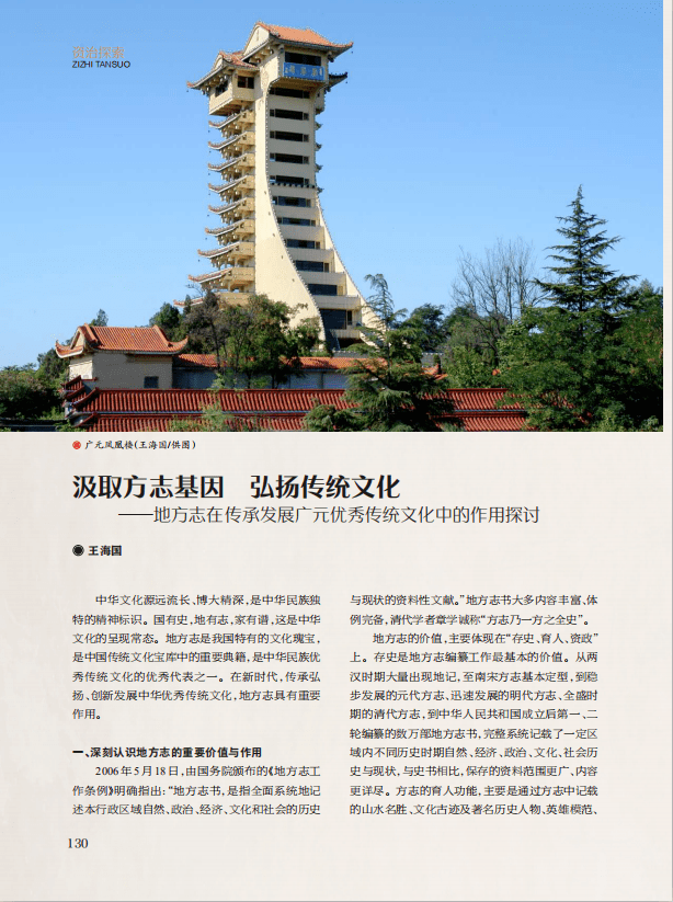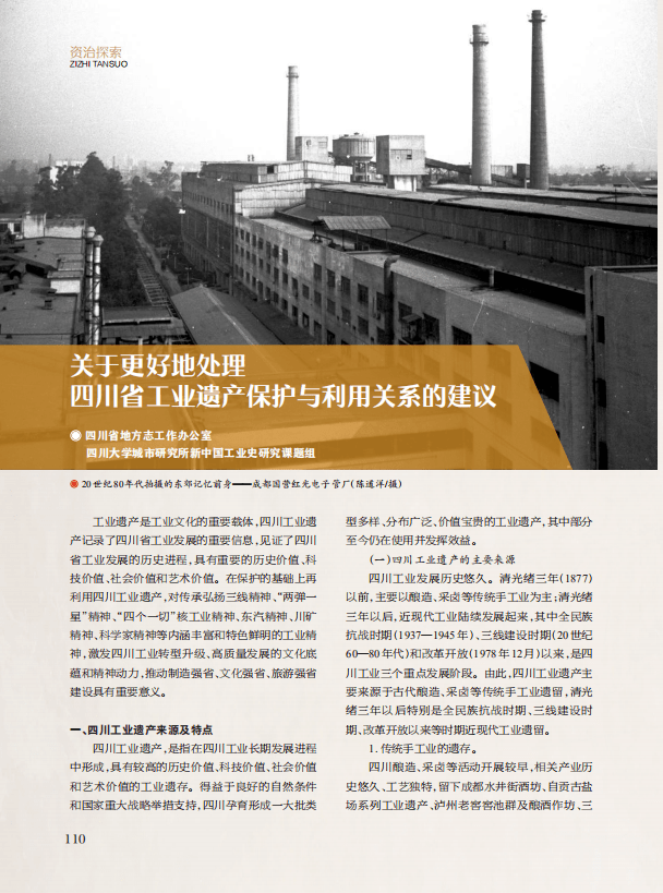 “资治探索”栏目,刊发《关于更好地处理四川省工业遗产保护与利用关系的建议》《梓潼翠云廊大石文化遗迹遗址调查研究及保护利用建议》《从符号学角度看民间艺术如何拓展应用场景 ——以藏羌织绣传承人杨华珍为例》《汲取方志基因 弘扬传统文化——地方志在传承发展广元优秀传统文化中的作用探讨》4篇文章,分别梳理了四川省工业遗产来源及特点,介绍了四川工业遗产保护利用的主要形式,指出四川工业遗产保护利用中存在的问题,对处理好四川省工业遗产保护与利用提出了意见和建议;对梓潼翠云廊大石文化遗迹遗址开展调查研究并就保护利用提出了务实建议;从美术的角度和符号学的角度,探寻杨华珍的成功之道,为更多民间艺术的传承、推广、发展提供有益借鉴;以广元为例,探讨了在新时代地方志如何传承弘扬、创新发展中华优秀传统文化。