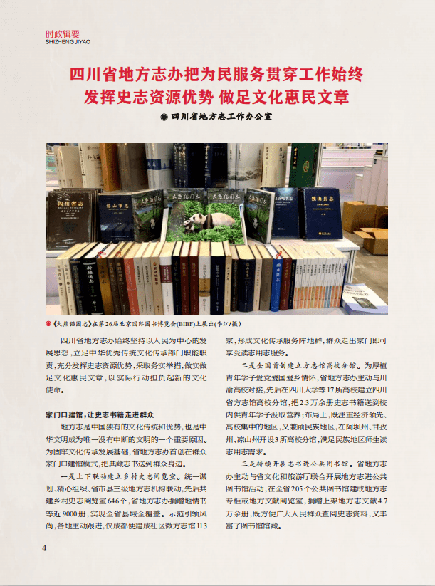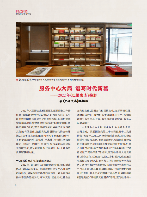 “时政辑要”栏目,刊发《四川省地方志办把为民服务贯穿工作始终 发挥史志资源优势 做足文化惠民文章》《服务中心大局 谱写时代新篇——2022年〈巴蜀史志〉掠影》《传播优秀传统文化 提升方志育人功效“方志文化进高校”首场活动在西华师范大学举行》3篇文章,前文客观全面介绍近年来省地方志办始终坚持以人民为中心的发展思想,立足中华优秀传统文化传承部门职能职责,充分发挥史志资源优势,通过家门口建馆、创造性转化、立体化宣传做实做足文化惠民文章,以实际行动担负起新时代新的文化使命的务实举措。《服务中心大局 谱写时代新篇——2022年〈巴蜀史志〉掠影》一文,总结了2022年以来《巴蜀史志》充分发挥传承发展中华优秀传统文化的有效载体、挖掘和弘扬巴蜀文化的宣传阵地、方志事业发展的重要内容和平台的窗口作用,在提升服务能力、打造精品史志期刊、提高社会影响力、深得社会各界肯定几个方面取得的成绩和有益探索。后文综述了近期在西华师范大学创新举行的“方志文化进高校”首场活动情况。