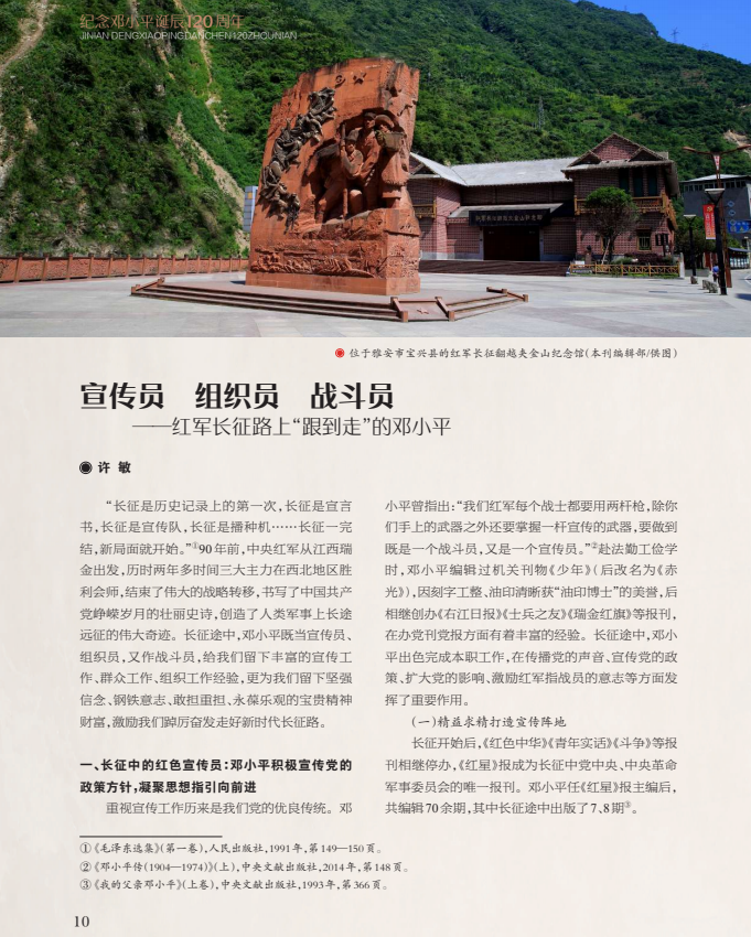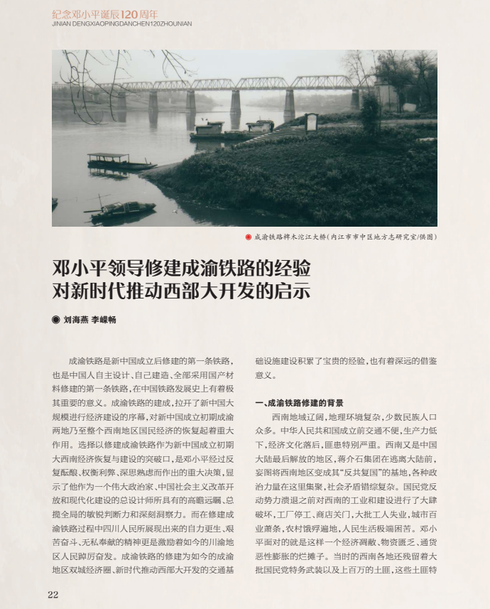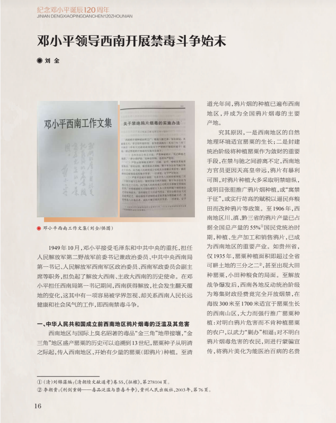 为纪念邓小平同志诞辰120周年,表达对邓小平同志崇高的敬意和深切的缅怀之情,本期组织策划了《宣传员组织员战斗员——红军长征路上“跟到走”的邓小平》《邓小平领导西南开展禁毒斗争始末》《邓小平领导修建成渝铁路的经验对新时代推动西部大开发的启示》《邓小平点燃四川率先改革之火——试论“成都点火”对开启四川改革的重要作用》4篇文章,回顾了邓小平同志为我国革命、建设、改革作出的卓越贡献,对家乡四川的深情和热爱,展现出邓小平同志信念坚定、热爱人民、实事求是、开拓创新、战略思维、坦荡无私的崇高品格和精神风范,是激励我们为实现中华民族伟大复兴不懈奋斗的强大精神动力。