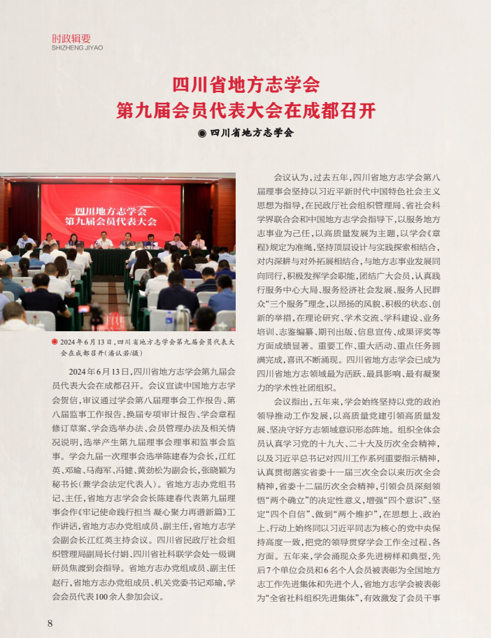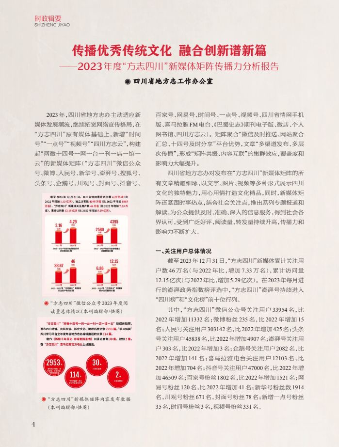 “时政辑要”栏目刊发2篇文章。《传播优秀传统文化融合创新谱新篇——2023年度“方志四川”新媒体矩阵传播力分析报告》一文,精准分析2023年度“方志四川”新媒体矩阵传播力实现大幅攀升,梳理总结好的经验做法和取得的优异成绩,展现出四川方志人始终坚持质量第一、求真务实的工作作风,彰显出四川方志人始终坚持传播弘扬中华优秀传统文化、革命文化、社会主义先进文化、巴蜀文化的责任担当和不懈追求;《四川省地方志学会第九届会员代表大会在成都召开》一文,聚焦介绍四川省地方志学会第九届会员代表大会概况,系统总结四川省地方志学会过去5年在理论研究、学术交流、成果评奖等方面取得的突出成绩,提出继续坚持以习近平新时代中国特色社会主义思想为指引,担负“为党立言、为国存史、为民修志”历史使命,加强“存史、育人、资政”各项工作,助力四川地方志事业高质量发展,为四川省地方志学会发展指明努力方向。