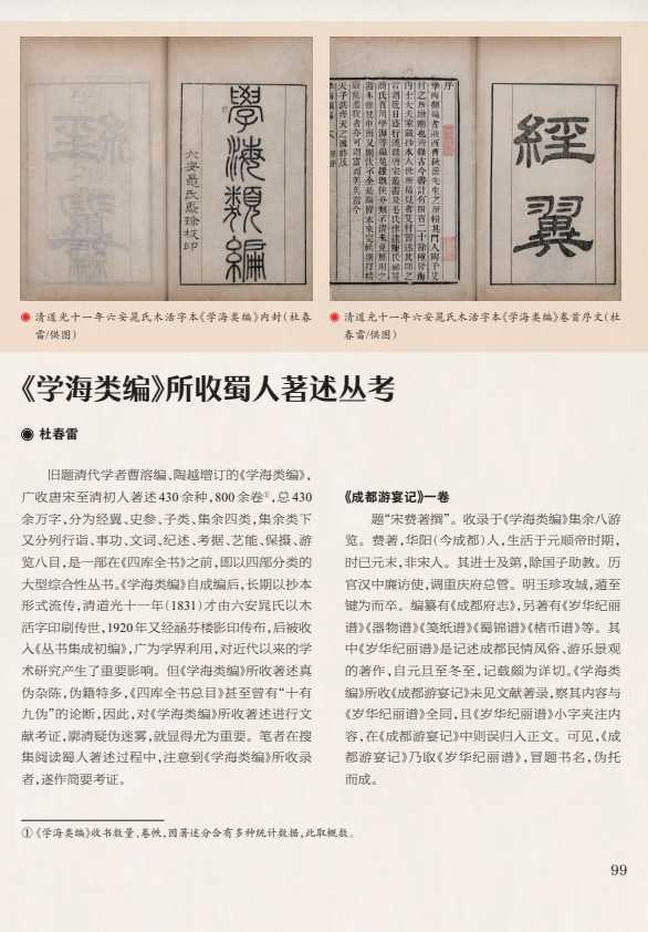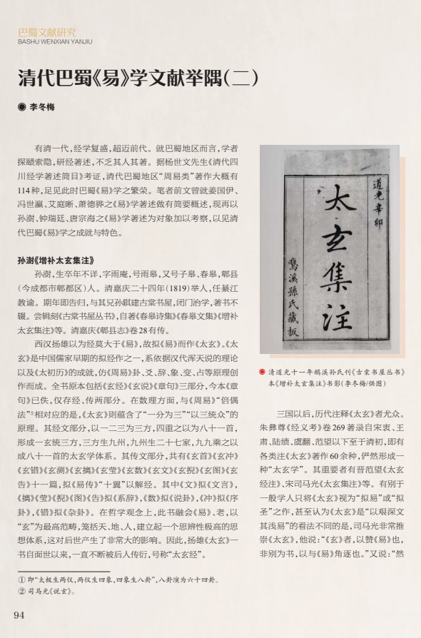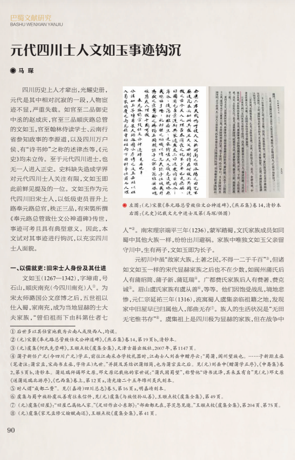 “巴蜀文献研究”栏目刊发3篇文章。其中,《元代四川士人文如玉事迹钩沉》一文,从文如玉以儒就吏到矫矫国士,体现出宋代文化家族在元代传承的缩影,印证了儒家文化在元代四川的延续性,具有极强的史料价值;《清代巴蜀〈易〉学文献举隅(二)》一文,作者前文已就姜国伊、冯世瀛、艾庭晰、萧德骅的《易》学著述作简要概述,本篇再以孙澍、钟瑞廷、唐宗海的《易》学著述为对象加以考察,全面体现清代巴蜀《易》学的成就与特色;《〈学海类编〉所收蜀人著述丛考》一文,以《学海类编》所收录的蜀人著述为考证,认为《学海类编》所收著述真伪混杂,提出需要对其进行考证辨伪的观点。
