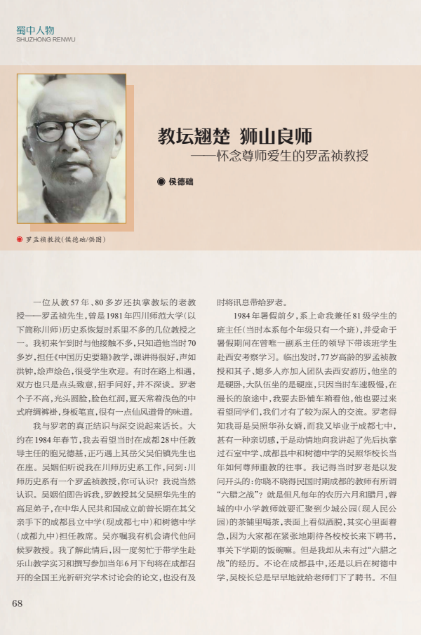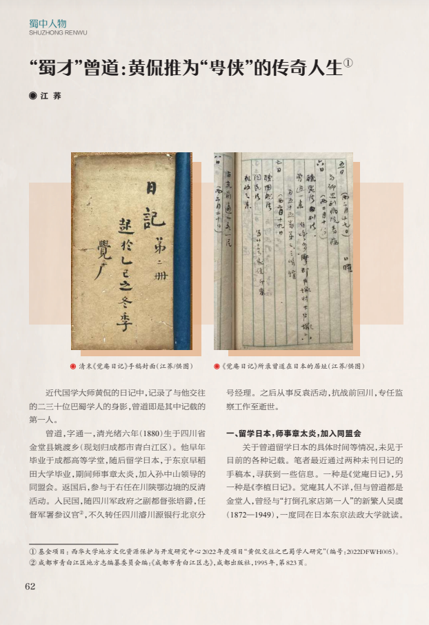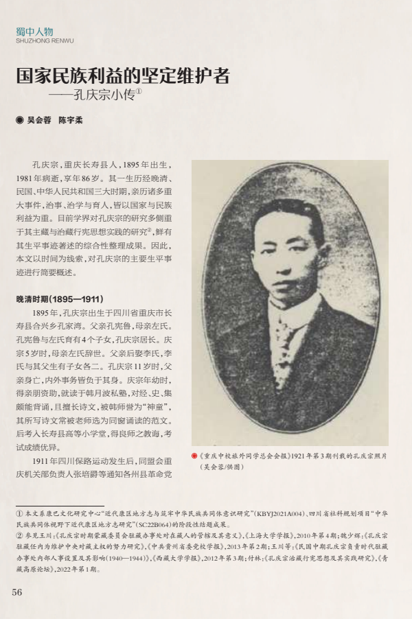 “蜀中人物”栏目刊发3篇文章。其中,《国家民族利益的坚定维护者——孔庆宗》一文,以时间为线索,简要概述孔庆宗主要生平事迹,彰显了孔庆宗强烈的爱国情怀和民族精神,是鲜有介绍其生平的综合性著述成果,有助于读者全面认识孔庆宗;《“蜀才”曾道:黄侃推为“甹侠”的传奇人生》一文,记述了曾道留学海外、追求理想、为友人仗义轻财、对妻子深情义重、从政官民同尊的传奇一生;《教坛翘楚狮山良师——怀念尊师爱生的罗孟祯教授》一文,讲述了罗孟祯教授忠诚于教育事业、毕生致力于教育事业的事迹,展现出他淡泊名利、诲人不倦、为国育才的高风亮节。