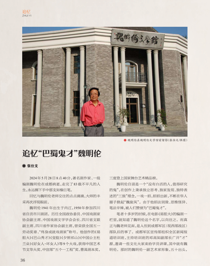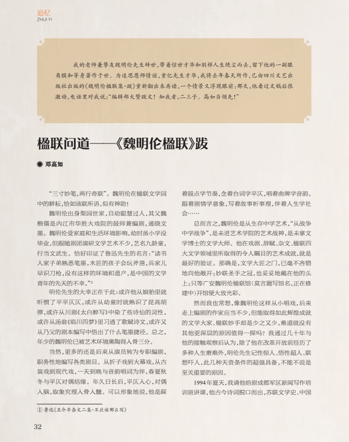 “追忆”栏目,刊发《楹联问道——〈魏明伦楹联〉跋》《追忆“巴蜀鬼才”魏明伦》2篇文章,深切缅怀魏明伦先生。作者分别回忆了与魏老结交的点滴过往,反映出魏老以笔作犁、躬耕俯首的高尚情操,将一位文学大家、楹联妙手的名家风采和人格魅力展现在读者眼前。