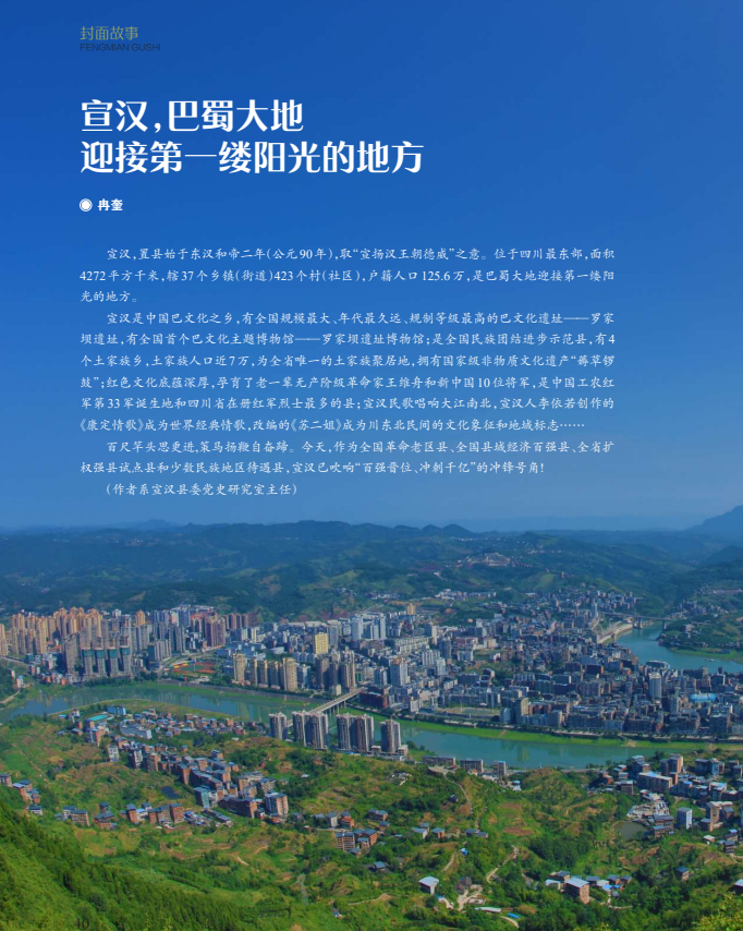 “封面故事”以中国巴文化之乡、全国革命老区县、全国县域经济百强县宣汉为记述单元,刊发《宣汉,巴蜀大地迎接第一缕阳光的地方》一文,通过“巴国迷雾知多少”“土家风情惹醉”“川东热土别样红”“高歌一曲惊天下”“大汉雄风今犹在”5个篇章,图文并茂介绍宣汉的历史由来、风土人情、红色文化及经济发展,多维视角解读宣汉独有魅力,充分展现宣汉县悠久的历史文化、厚重的红色文化和独特的本土文化。