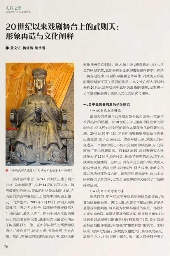 “史料之窗”栏目,刊发《张大千成都金牛坝旧居研究(下)》《20世纪以来戏剧舞台上的武则天:形象再造与文化阐释》《苏东坡的税收思想探析》3篇文章。其中,《20世纪以来戏剧舞台上的武则天:形象再造与文化阐释》一文,系统介绍20世纪以来戏剧中武则天形象的演变,丰富和拓展了关于武则天文化的研究与理解,推动武则天形象向更加多元、客观和真实的方向发展,具有重要的学术价值和现实意义。