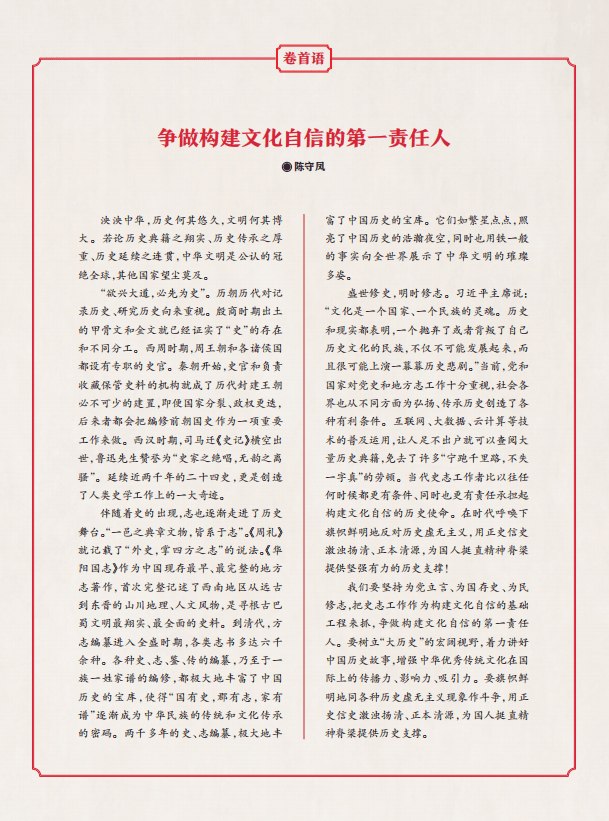 盛世修史,明时修志。习近平主席说:“文化是一个国家、一个民族的灵魂。历史和现实都表明,一个抛弃了或者背叛了自己历史文化的民族,不仅不可能发展起来,而且很可能上演一幕幕历史悲剧。”当前,党和国家对党史和地方志工作十分重视,社会各界也从不同方面为弘扬、传承历史创造了各种有利条件。互联网、大数据、云计算等技术的普及运用,让人足不出户就可以查阅大量历史典籍,免去了许多“宁跑千里路,不失一字真”的劳顿。当代史志工作者比以往任何时候都更有条件、同时也更有责任承担起构建文化自信的历史使命。在时代呼唤下旗帜鲜明地反对历史虚无主义,用正史信史激浊扬清、正本清源,为国人挺直精神脊梁提供坚强有力的历史支撑!