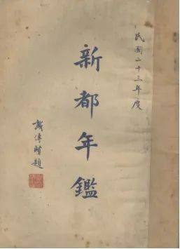 《新都年鉴(民国二十四年度)》。该年鉴由新都年鉴编纂委员会编纂,编委会共9人(赵宗焌、黄晓沧、罗靖陶、陈光辉、魏隶展、鲁自昌、陈伯时、杨子文、汤克敬)。时任县长柯仲生主持并作序。书名由戴传贤题。全书共267页,设县治、县政、商业、工业、农业、党务、文献、社会情形、杂载9部分。由启文印刷局印刷。该年鉴也是省内首部成立了年鉴编纂委员会的年鉴,此法沿用至今。