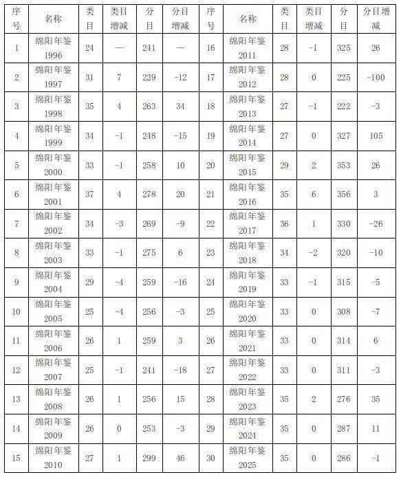 《绵阳年鉴》30年的类目、分目变化统计情况