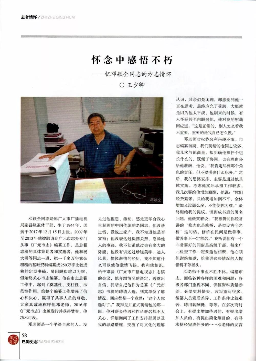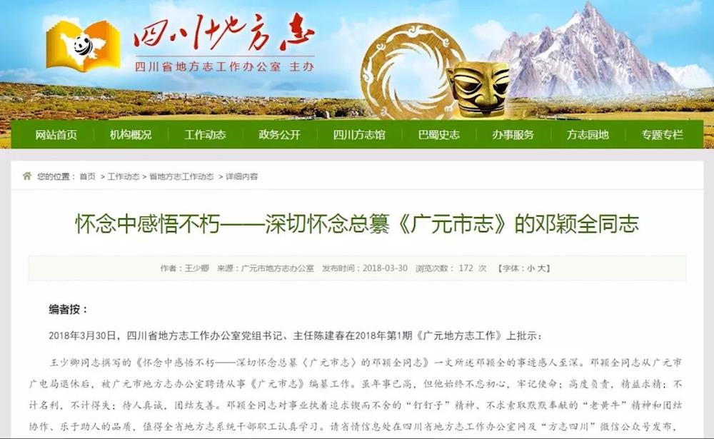 2018年3月30日,“四川地方志”网刊发王少卿《怀念中感悟不朽——深切怀念总纂<广元市志>的邓颖全同志》一文