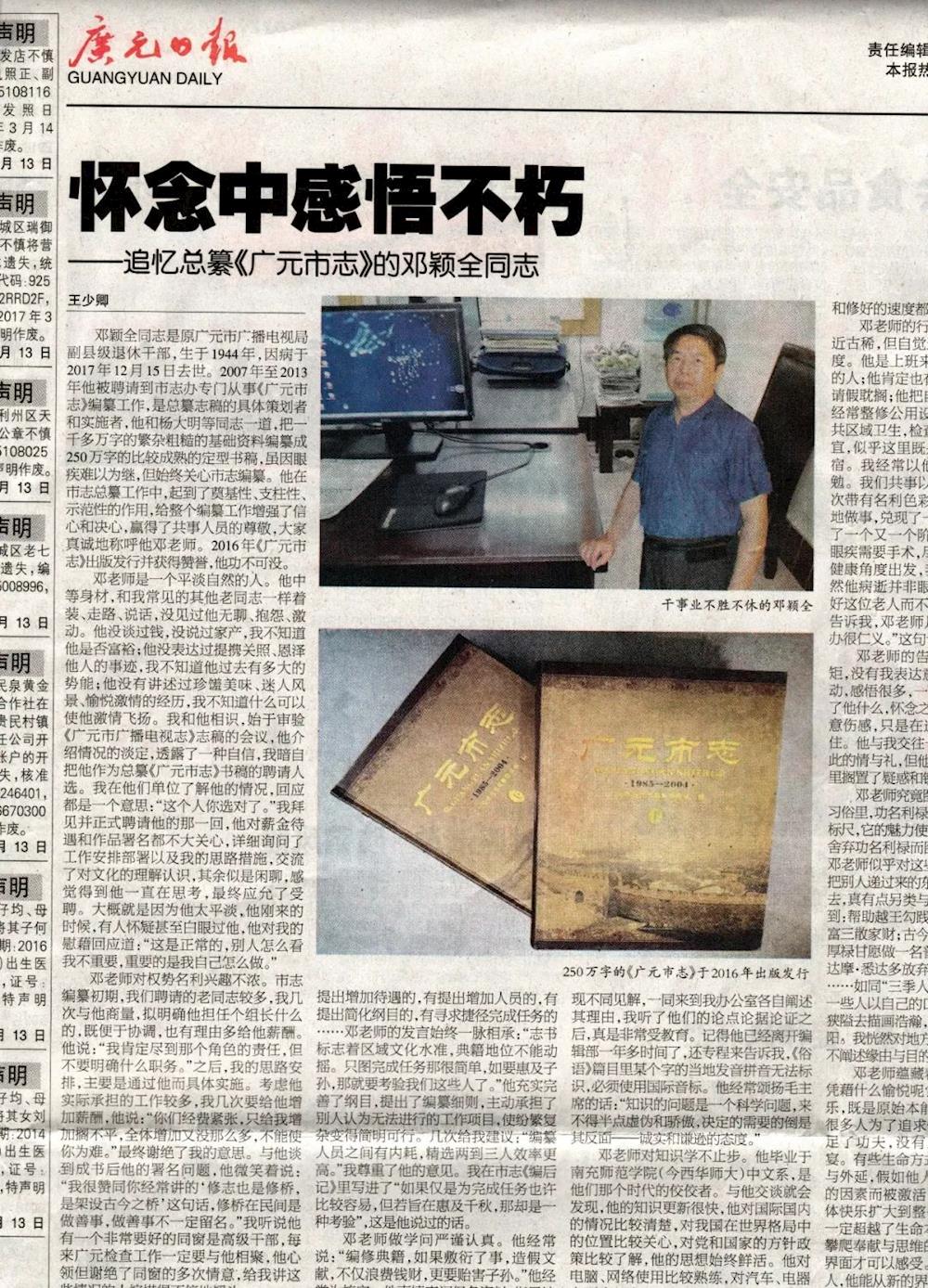 2018年5月13日,《广元日报》发表王少卿《怀念中感觉悟不朽—追忆总纂<广元市志>的邓颖全同志》一文