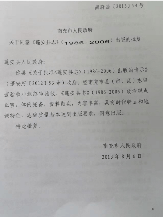 根据终审意见,县志办组织力量对《县志》继续进行修改完善。2013年8月6日,经南充市县(市、区)志审查验收小组终审验收,一致认为:“《蓬安县志(1986-2006)》政治观点正确,体例完整,资料翔实,内容丰富,具有时代特点和地域特色,志稿质量达到出版要求,同意出版。”