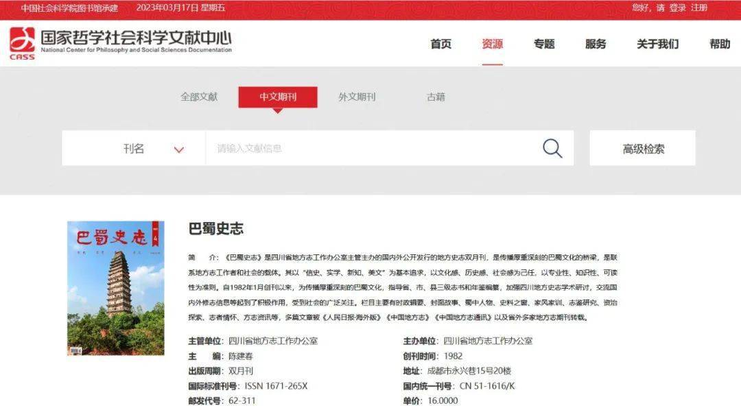 国家哲学社会科学文献中心对《巴蜀史志》的介绍