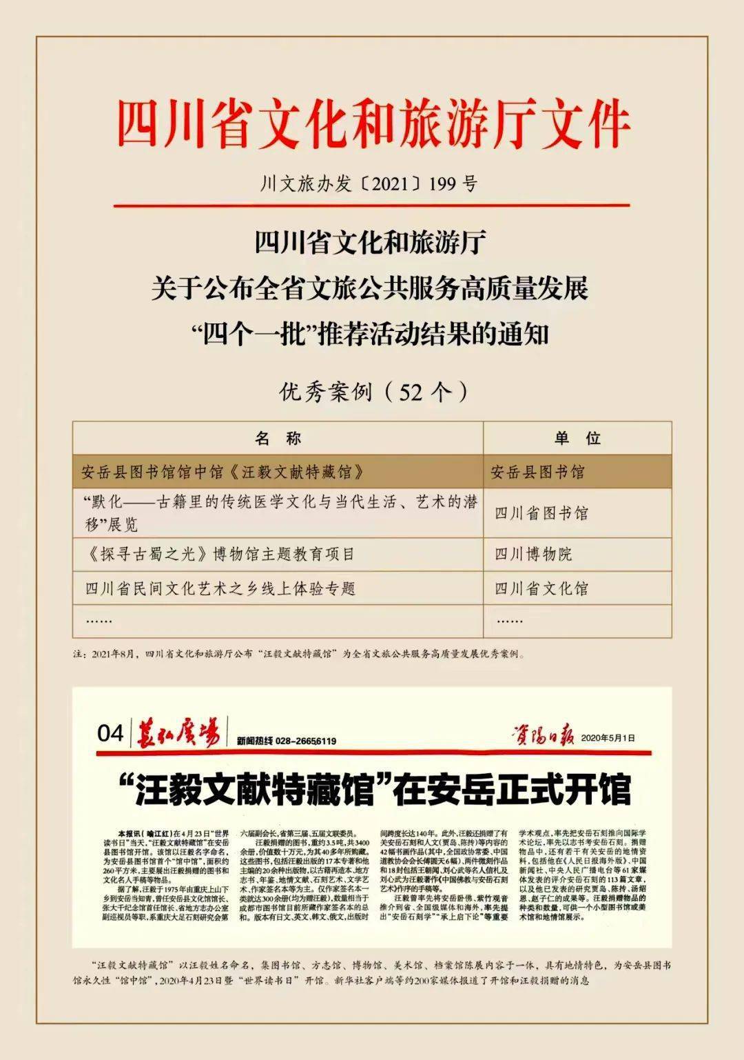 开全国方志界先河,在四川省安岳县图书馆建“汪毅文献特藏馆”,集图书馆、地情馆、博物馆、美术馆展陈内容为一体,为安岳心安图书馆永久性“馆中馆”,被四川省文化和旅游厅公布为全省公共服务高质量发展优秀案例,系地方志系统个人命名馆的唯一。馆中有许多珍贵文献资料和书画作品,可交易、可传家,但汪毅先生知道,独乐乐不如众乐乐,只有把珍贵的资料和文献作为公共馆藏,才能为大众共享,才能经久传世。这是心底无私的高尚情操,为个人处理重要文献资料开辟了新路。