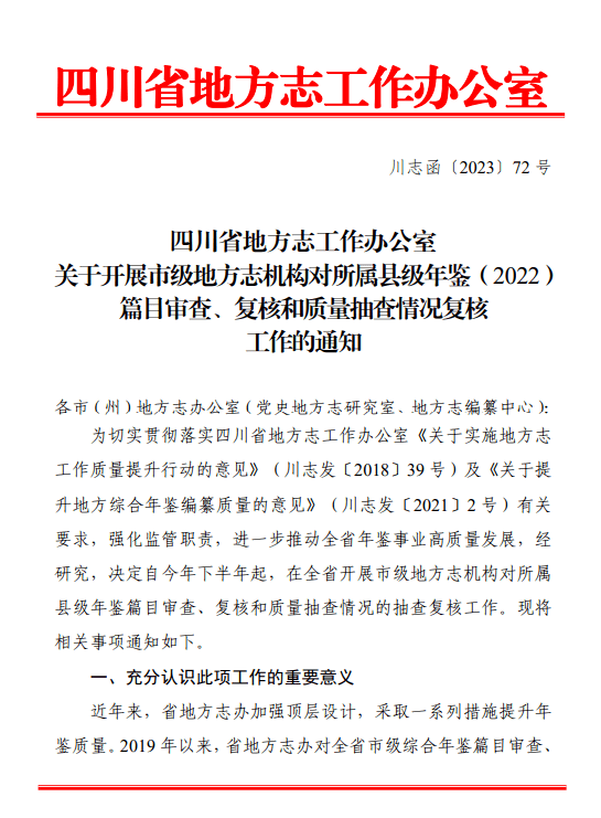 为切实贯彻落实四川省地方志工作办公室《 关于实施地方志工作质量提升行动的意见 》及《 关于提升地方综合年鉴编纂质量的意见 》有关要求,强化监管职责,推动全省年鉴事业高质量发展, 8月 1日,省地方志办印发通知,明确自今年下半年起,在全省开展市级地方志机构对所属县级年鉴篇目审查、复核和质量抽查情况的抽查复核工作,以更细更具体的举措提升全省地方综合年鉴质量。