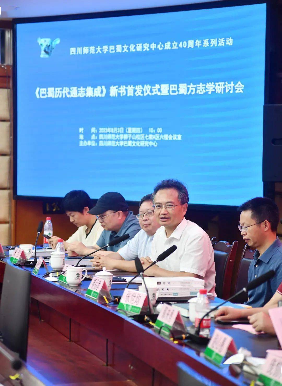 2023年8月3日上午,四川师范大学巴蜀文化研究中心主办的《巴蜀历代通志集成》新书首发仪式暨巴蜀方志学研讨会在四川师范大学狮子山校区召开。西南民族大学原校长、二级教授赵心愚,成都地图出版社社长鄢来勇,成都时代出版社副总编辑庞惊涛,四川大学教授、中国宋史研究会副会长粟品孝,四川大学教授、《巴蜀历代通志集成》副主编李勇先,西南民族大学教授张世均,成都大学天府文化研究院院长、教授谭平,成都时代出版社编辑部主任蒋雪梅,《中国社会科学报》主任曾江,内江师范学院巴蜀方志文化研究中心主任黄文记,四川心悦美术馆馆长魏心田,四川师范大学巴蜀文化研究中心研究员、《巴蜀历代通志集成》主编王川,《四川师范大学学报》副主编(主持工作)唐普,四川师范大学外国语学院副院长佘振华,中华传统文化学院副院长王勇,大西南研究中心主任朱晓舟,以及四川大学、四川师范大学多位教师、博士生代表30余人参加了会议。会议由四川师范大学历史文化与旅游学院副院长、巴蜀文化研究中心研究员、《巴蜀历代通志集成》副主编马磊主持。本次活动由四川师范大学 中华传统文化学院、大西南研究中心协办。