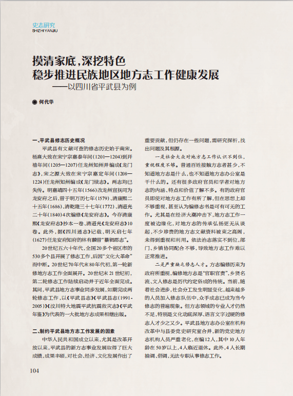 编写民族地区新方志的目的在于了解本地区内各民族共同发展和建设的成就,总结发展规律,为党委政府制定发展战略提供参考。要达到这一目的,关键在于突出地方民族性和民族地方性特色。平武县的地方特点是历史悠久,多民族聚居。在前两轮修志过程中,对此特点认识不深,对本地民族历史特别是羌族的历史挖掘不够,从而没有充分突出平武地域民族特色。因此,稳步推进平武县地方志工作健康发展,须在深挖其地域民族特色方面下深功夫。从业务方面讲,具体要做好三个方面的工作。
