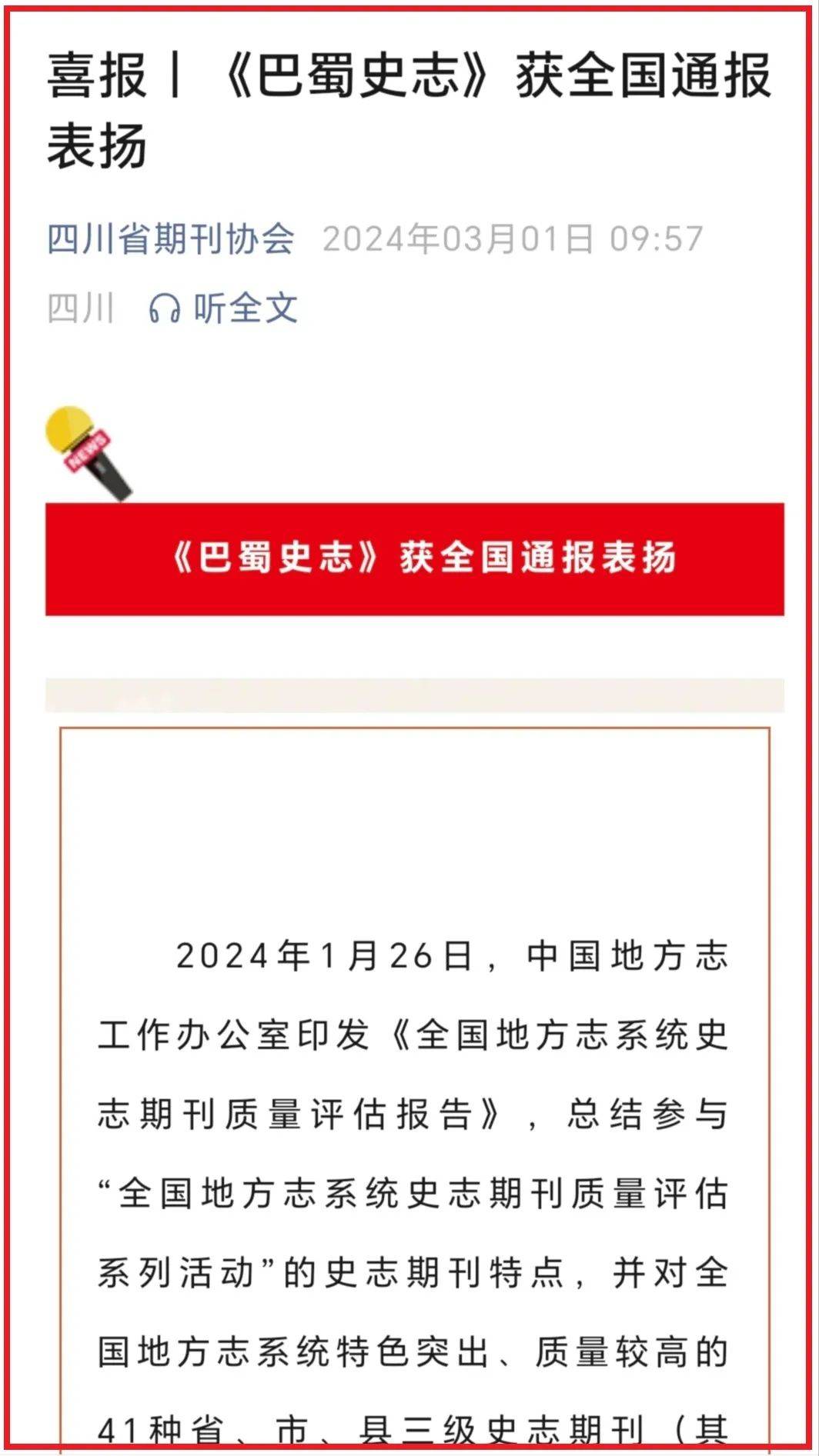 人民网-四川频道、四川省人民政府网、四川新闻网、川观新闻、学习强国、四川省期刊协会等网站及新媒体平台对《巴蜀史志》进行宣传报道
