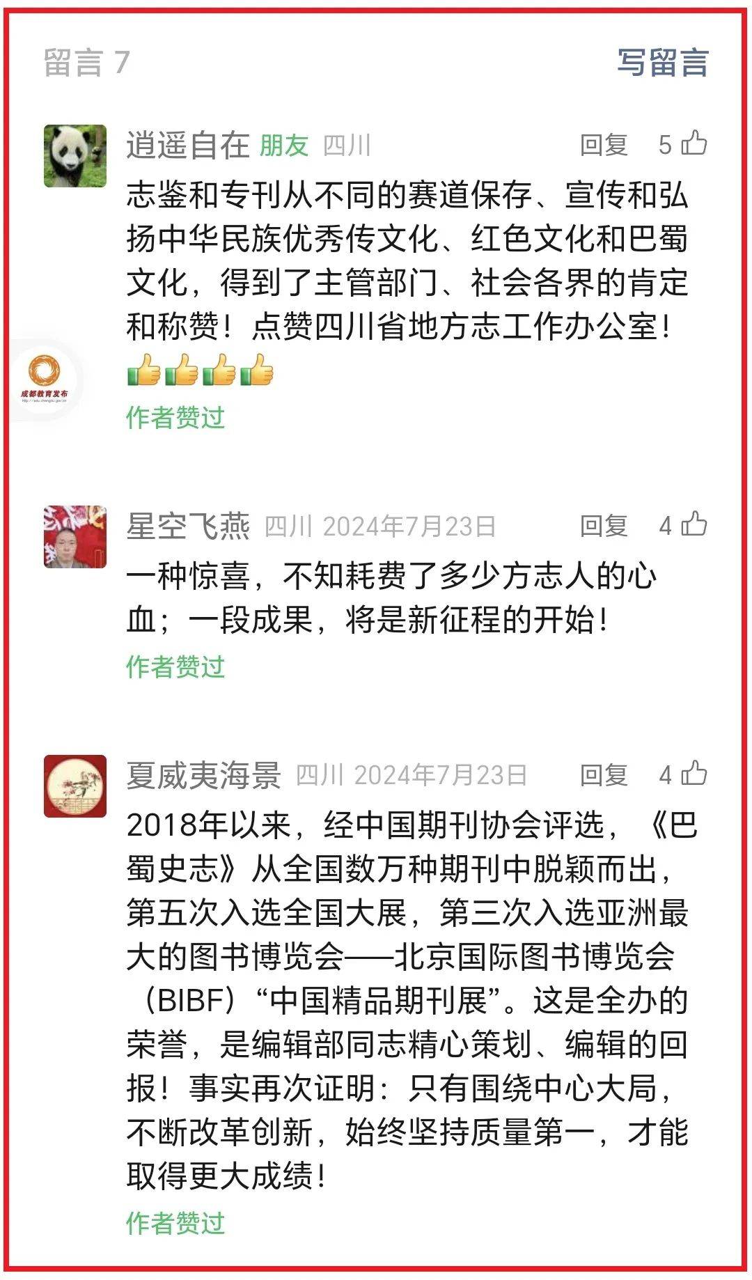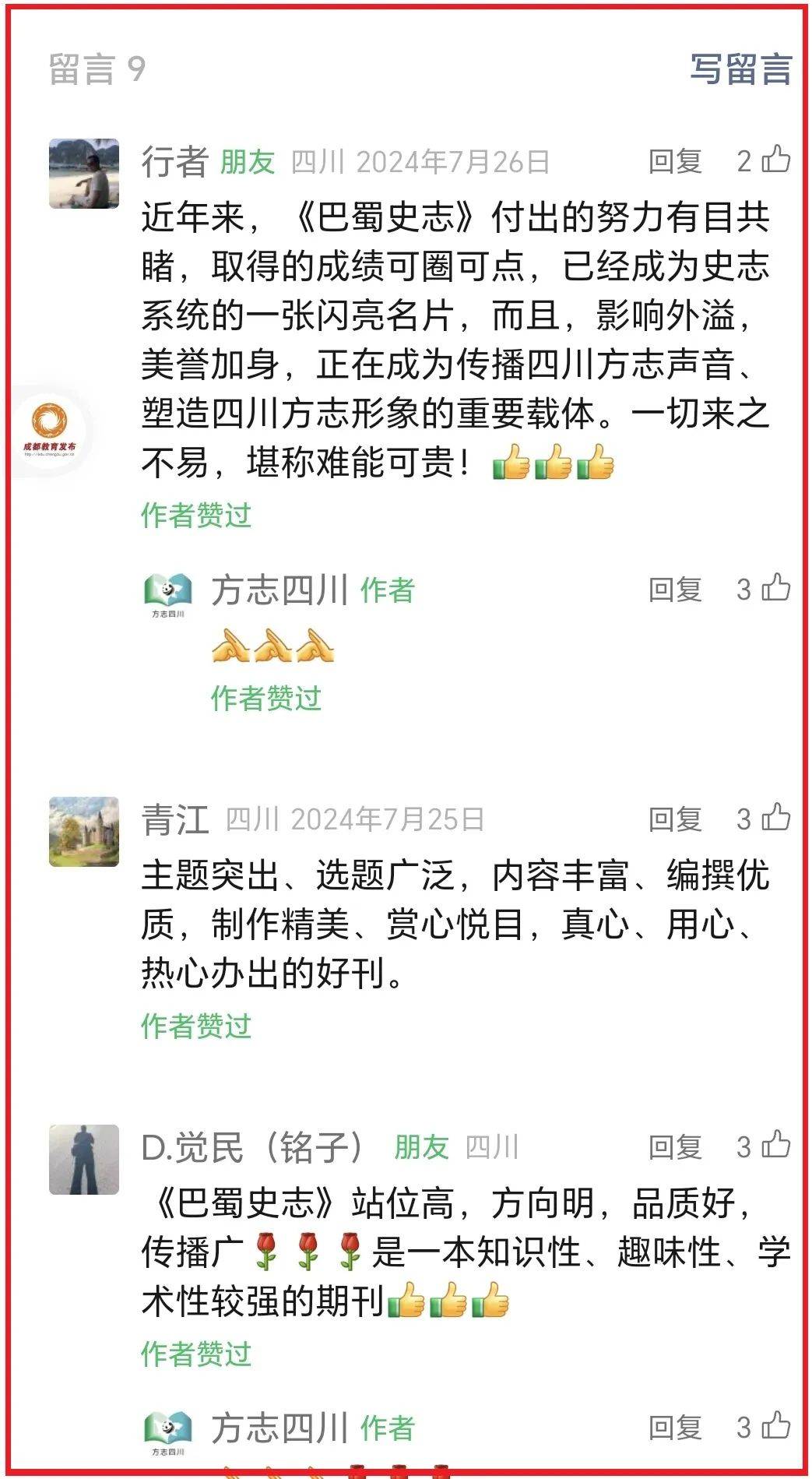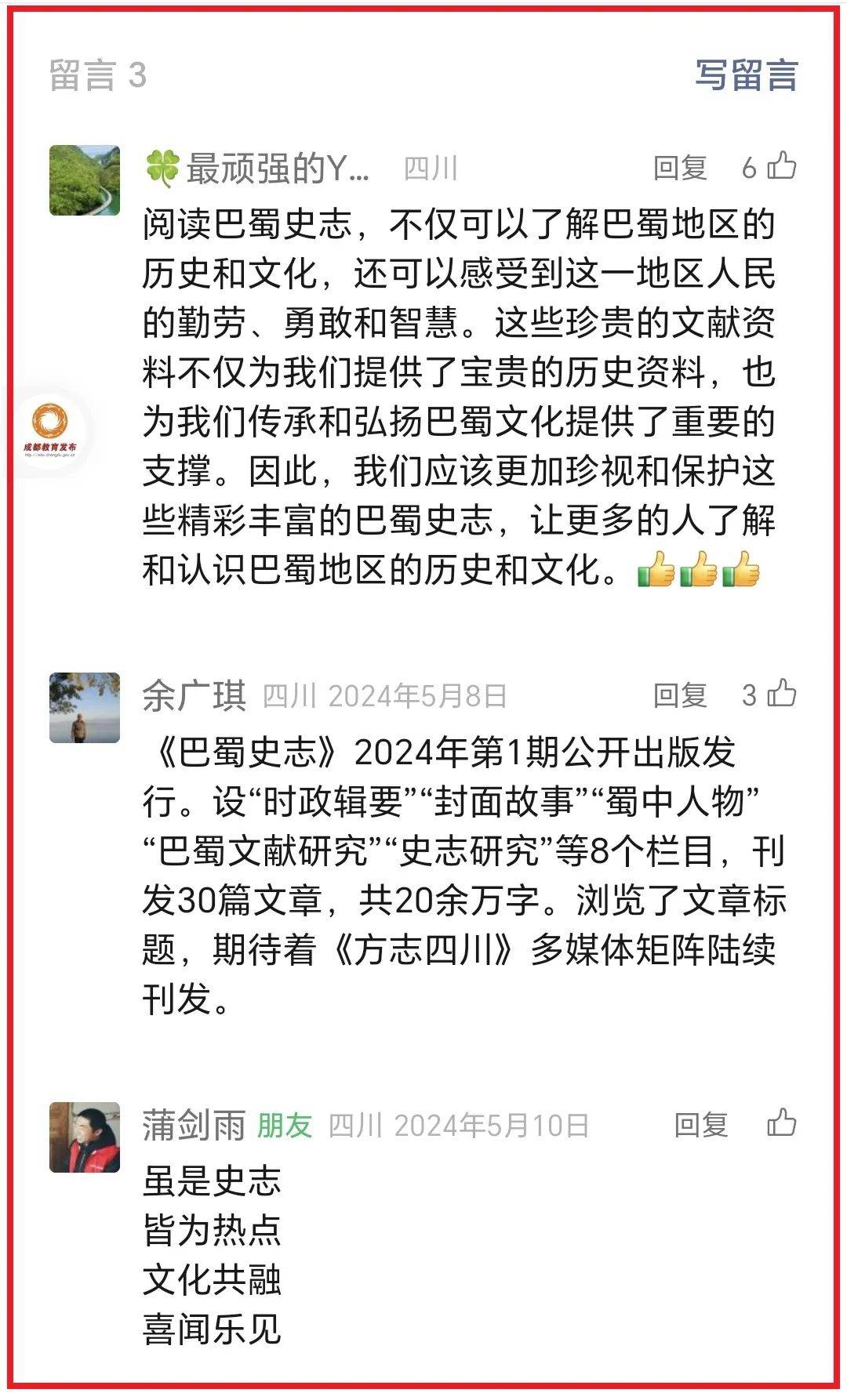 《巴蜀史志》相关信息在“方志四川”微信平台发布后众多网友留言点赞激励