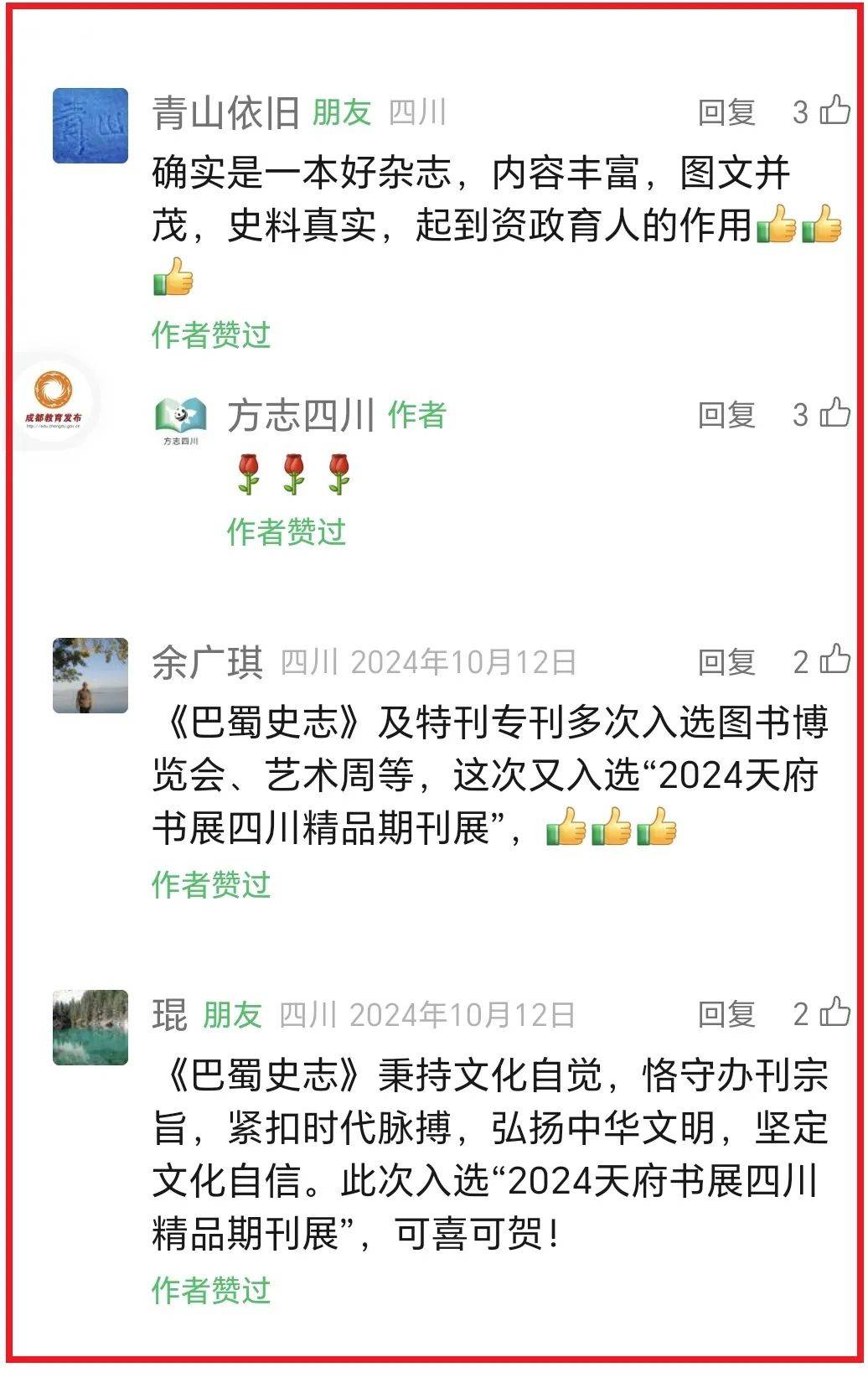 二是充分利用系统内宣传阵地,得到广泛认可。充分利用四川省地方志办“方志四川”新媒体矩阵,加强出刊、内容信息宣传及优秀文章转发,获社会各界赞誉。5月8日,“方志四川”发布《〈巴蜀史志〉2024年第1期出刊》,网友“最顽强的YPA”留言:“阅读《巴蜀史志》,不仅可以了解巴蜀地区的历史和文化,还可以感受到这一地区人民的勤劳、勇敢和智慧。这些珍贵的文献资料不仅为我们提供了宝贵的历史资料,也为我们传承和弘扬巴蜀文化提供了重要的支撑。”7月23日,“方志四川”发布《〈巴蜀史志〉入选第三十届北京国际图书博览会(BIBF)“2024中国精品期刊展”推荐期刊》,网友“逍遥自在”留言:“志鉴和专刊从不同的赛道保存、宣传和弘扬中华优秀传统文化、红色文化和巴蜀文化,得到主管部门、社会各界的肯定和称赞!点赞四川省地方志工作办公室。”7月25日,“方志四川”发布《〈巴蜀史志〉在四川期刊高质量发展暨〈四川典型期刊办刊经验与实践〉写作交流会上作办刊经验交流发言》,网友“D.觉民(铭子)”留言:“《巴蜀史志》站位高,方向明,品质好,传播广,是一本知识性、趣味性、学术性较强的期刊。”网友“唐及民”留言:“《巴蜀史志》紧跟时代脉搏,突出史志特色,优质高效,是为数不多的精品期刊!”10月12日,“方志四川”发布《〈巴蜀史志〉入选2024天府书展四川精品期刊展》,网友“琨”留言:“《巴蜀史志》秉持文化自觉,恪守办刊宗旨,紧扣时代脉搏,弘扬中华文明,坚定文化自信。此次入选‘2024天府书展四川精品期刊展’,可喜可贺!”12月13日,“方志四川”发布《弘扬三线精神 谱写时代华章——〈巴蜀史志〉“三线建设”专刊出版》,网友“行者”留言:“传承历史,续写辉煌,这是地方志的基本使命和责任所系。厚厚的一本专刊,不但保存了难得的历史瞬间,也是四川方志服务中心大局、服务经济社会发展、服务人民群众理念的生动实践,彰显出方志人的主动担当意识,彰显出方志成果的重大社会价值。”