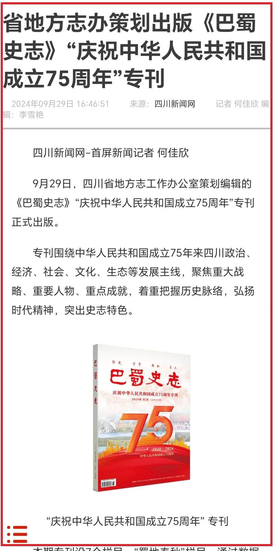 《巴蜀史志》“庆祝中华人民共和国成立75周年”特刊征文启事