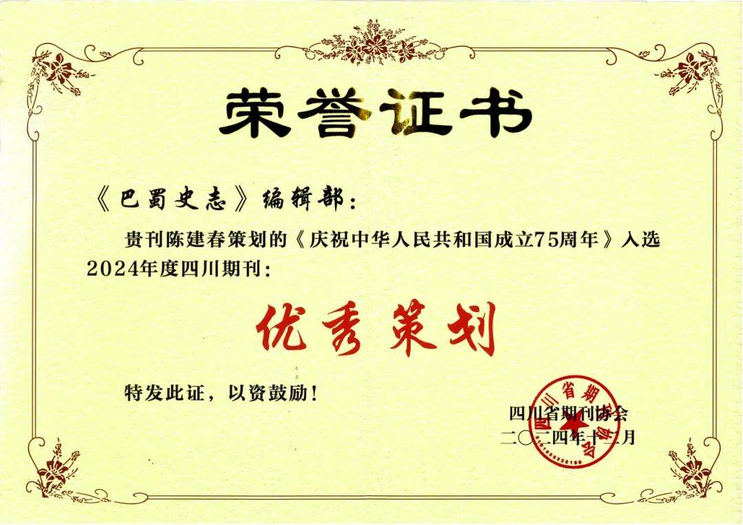 《巴蜀史志》“庆祝中华人民共和国成立75周年”专刊入选2024年度四川期刊“优秀策划”