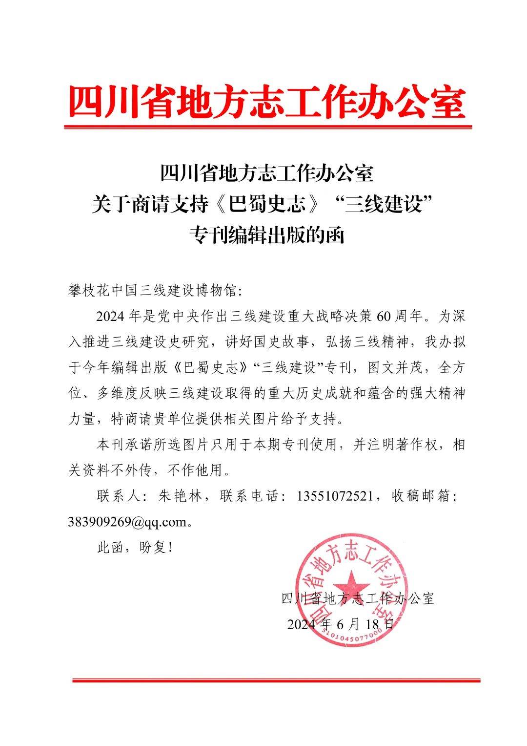 《巴蜀史志》“三线建设”专刊商请支持编辑出版的函。