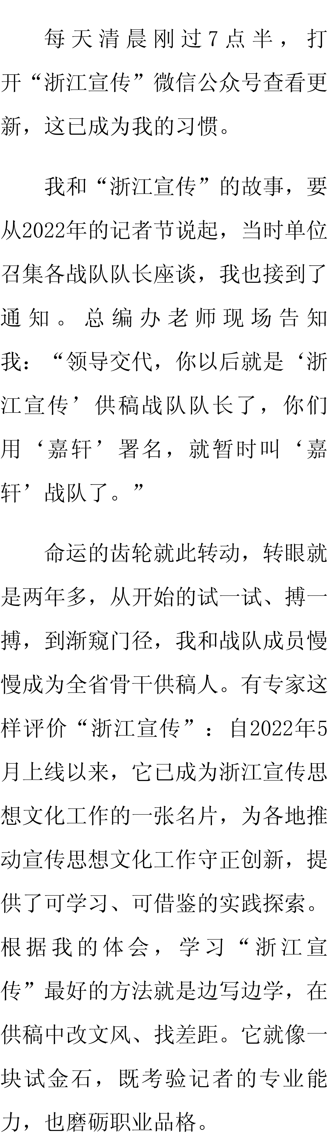 对记者而言,在“浙江宣传”上发布文章,就像一块试金石,既考验记者的专业能力,又磨砺职业品格。