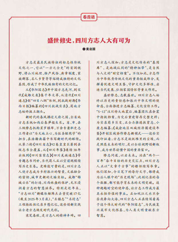 盛世修志,志载盛世。四川方志人始终以历史的责任感和振兴中华文明的使命感,全面推进方志编纂、文化宣传工作。“5·12”汶川特大地震后,编纂团队在余震中抢救档案,为灾后重建留存完整史料;为实录蜀乡巨变,正全力推进扶贫志、小康志编纂;《成渝地区双城经济圈建设年鉴》开创区域协作修志新模式……这些实践印证着:方志不是故纸堆里的尘埃,而是照亮未来的明灯,是以全球视野创新叙事,成为世界读懂中国的重要窗口。