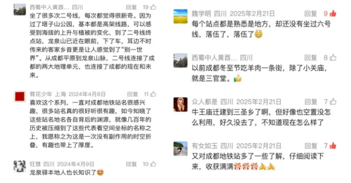 网友留言,“考证详实,引人入胜,地方志书读来妙趣横生,增长见闻,学到了”“每个地名、站名都有故事,用故事命名不仅纪念伟大,能记录历史,能彰显底蕴风范,更能传承文明”“成都的每一个地铁站,就是文化传播的载体,点赞”。