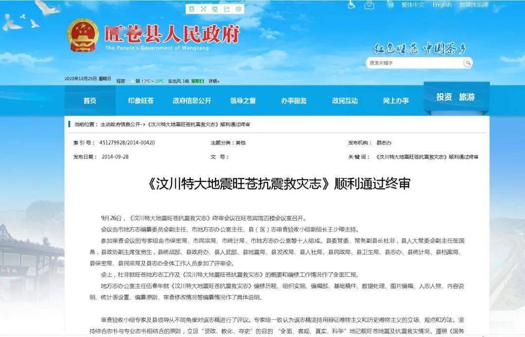 2014年9月28日,旺苍县人民政府网报道:《汶川特大地震旺苍抗震救灾志》顺利通过终审