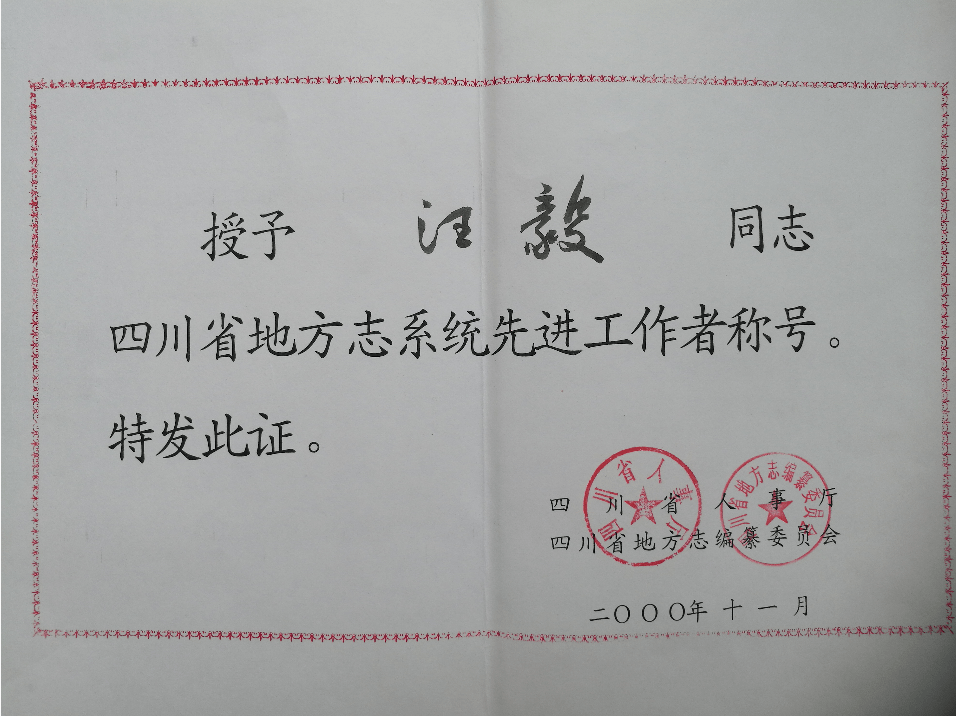 2000年11月,四川省人事厅、四川地方志编纂委员会授予汪毅“四川省地方志系统先进工作者”称号