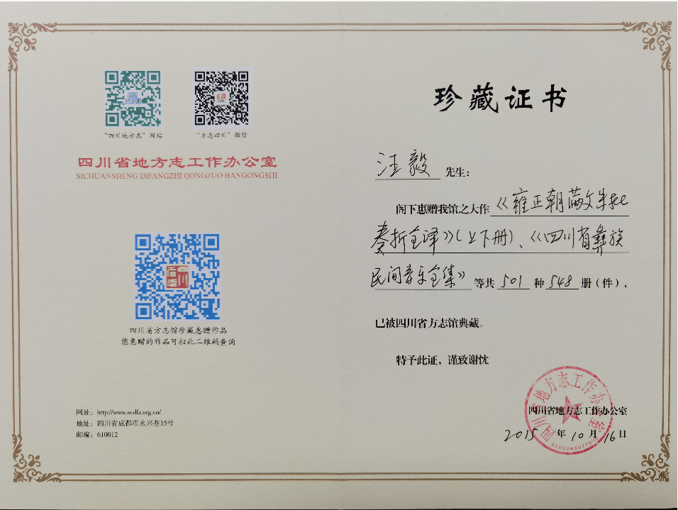 汪毅捐赠四川方志馆书籍珍藏证书(2015年10月16日)