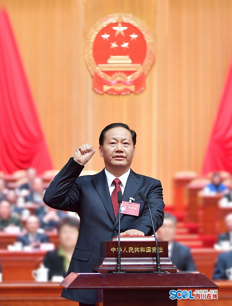 随后,举行宪法宣誓仪式。彭清华走上宣誓台,左手抚按宪法,右手举拳,面向全体人大代表庄严宣誓。新当选的省十三届人大常委会委员以及第十三届人民代表大会监察和司法委员会、社会建设委员会主任委员、副主任委员、委员也进行了宪法宣誓。