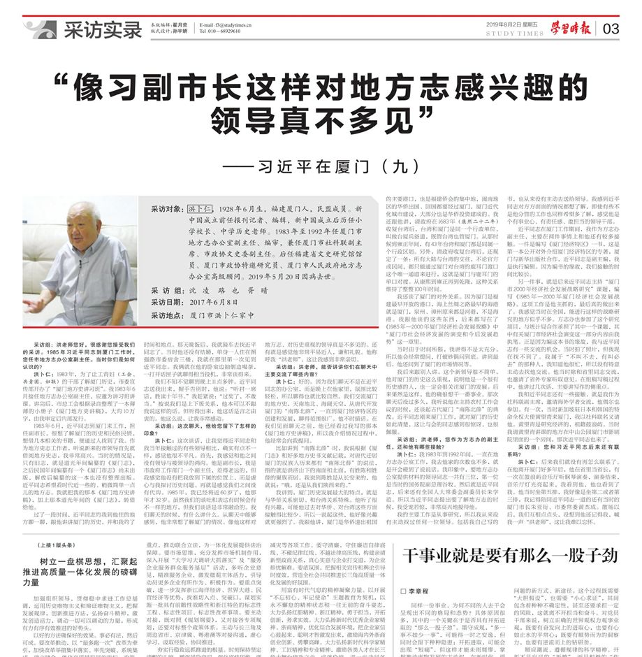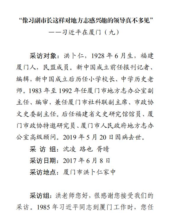 采访对象:洪卜仁,1928年6月生,福建厦门人,民盟成员。新中国成立前任报刊记者、编辑,新中国成立后历任小学校长、中学历史老师。1983年至1992年任厦门市地方志办公室副主任、编审,兼任厦门市社科联副主席、市政协文史委副主任。后任福建省文史研究馆馆员、厦门市政协特邀研究员、厦门市人民政府地方志办公室高级顾问。2019年5月20日因病去世(图片来源:2019年8月2日《学习时报》)