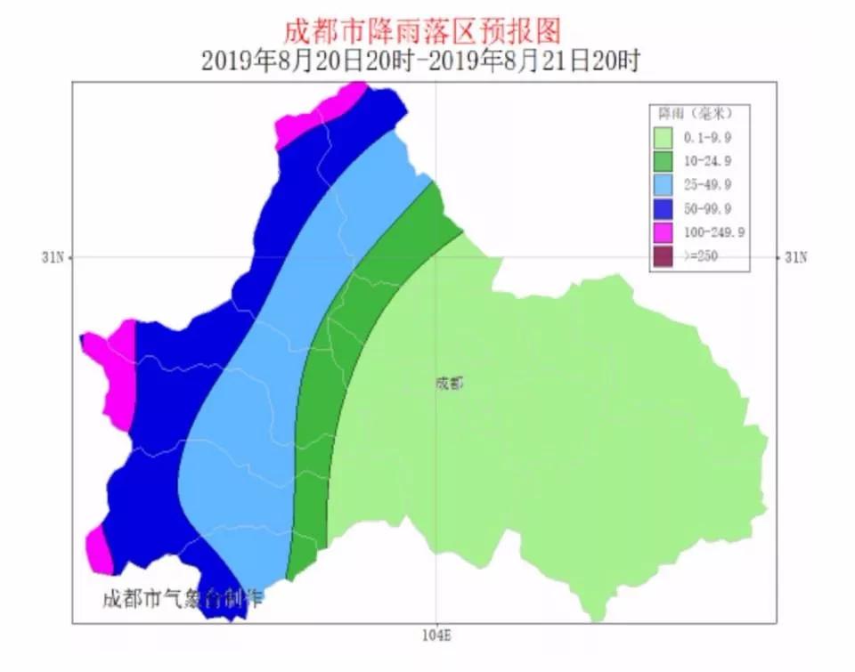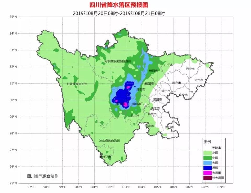 四川省气象台8月20日15时45分继续发布暴雨蓝色预警,预计20日20时到21日20时,盆地西部有雷雨或阵雨,其中雅安、成都西南部、眉山西部、乐山北部及阿坝州漩映地区有暴雨(雨量50-80毫米),局部地方大暴雨(雨量120-180毫米)。
