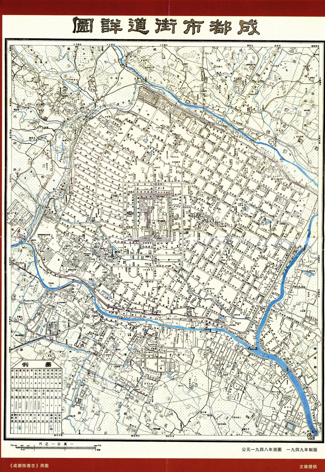 ▼这张成都市街道地图1948年测绘,1949年出版。