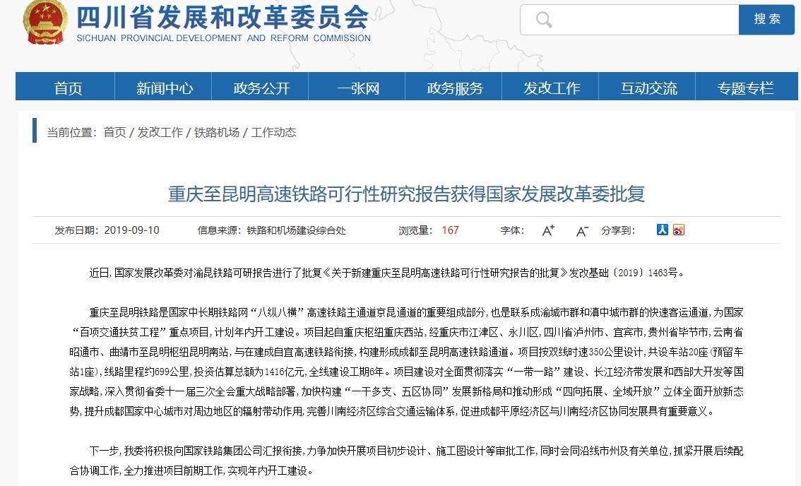 近日,国家发展改革委对渝昆铁路可研报告进行了批复《关于新建重庆至昆明高速铁路可行性研究报告的批复》发改基础〔2019〕1463号。