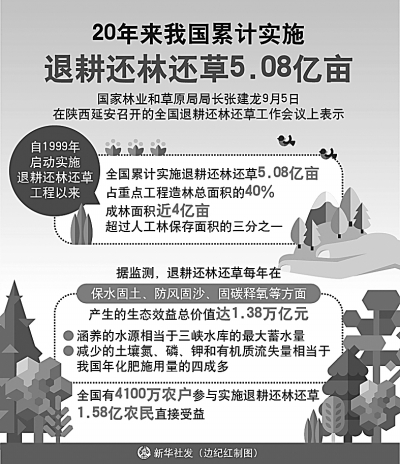 大规模退耕还林20年来,我国让5.08亿亩山川大地披上绿装,在水土流失严重的土地上掀起一场波澜壮阔的“绿色革命”,走出一条“绿水青山就是金山银山”的绿色发展道路,为世界提供了生态修复的“中国样本”。