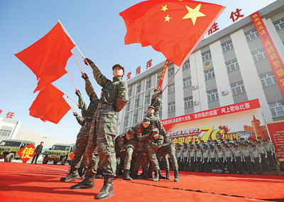 国庆前夕,天津国能瀚威公司员工面向他们自己绣的国旗,齐声喊出对祖国的祝福。公司负责人陈亮说:“我们以此向那些为祖国做出贡献的人致敬。”