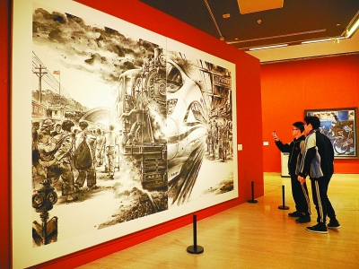 图为“打开的窗口是美丽的——庆祝新中国成立70周年暨深圳建市40周年美术作品展”现场。画中内容通过今昔对比,反映了人民群众出行交通工具的发展变化。杜建坡摄 光明图片/视觉中国