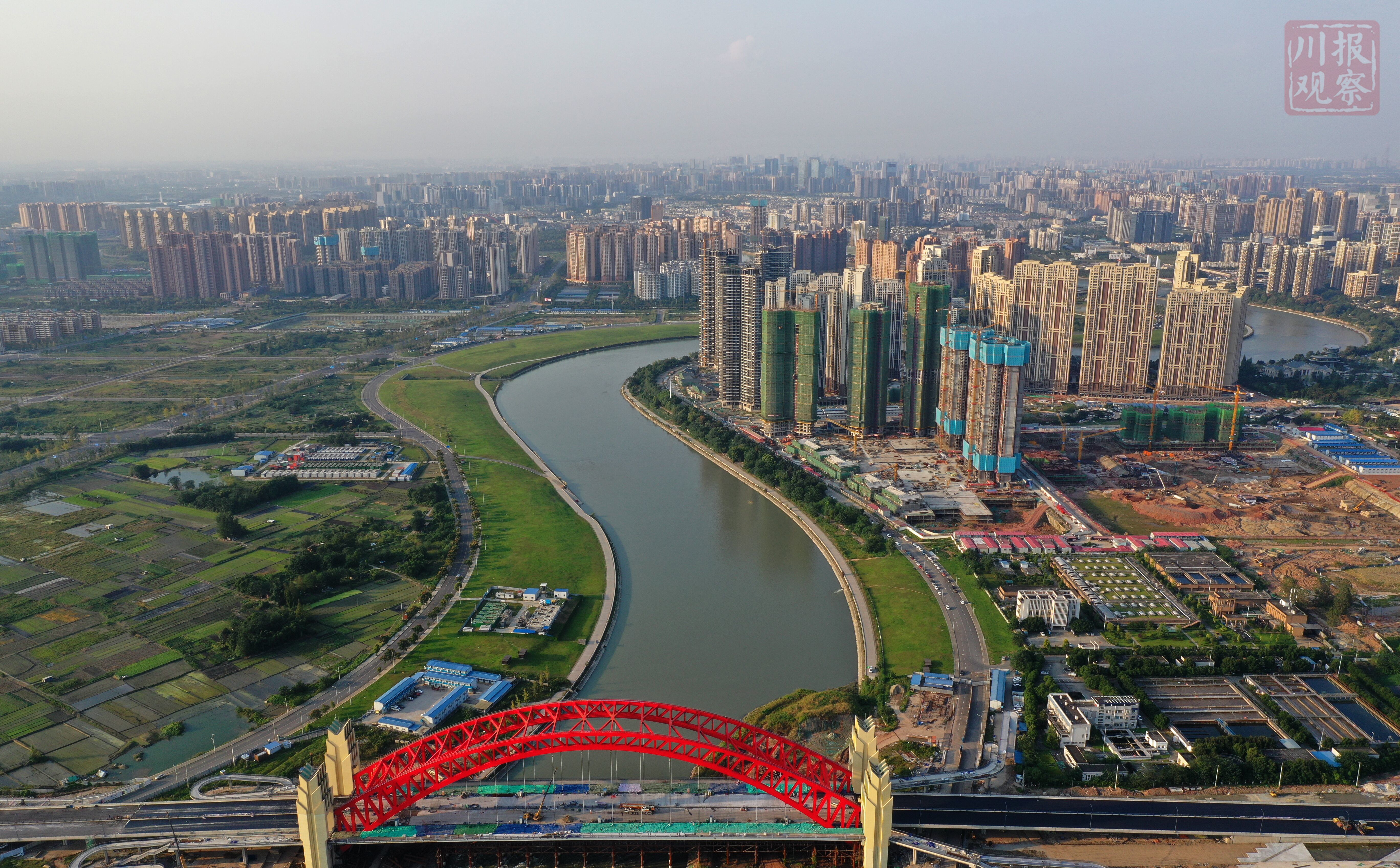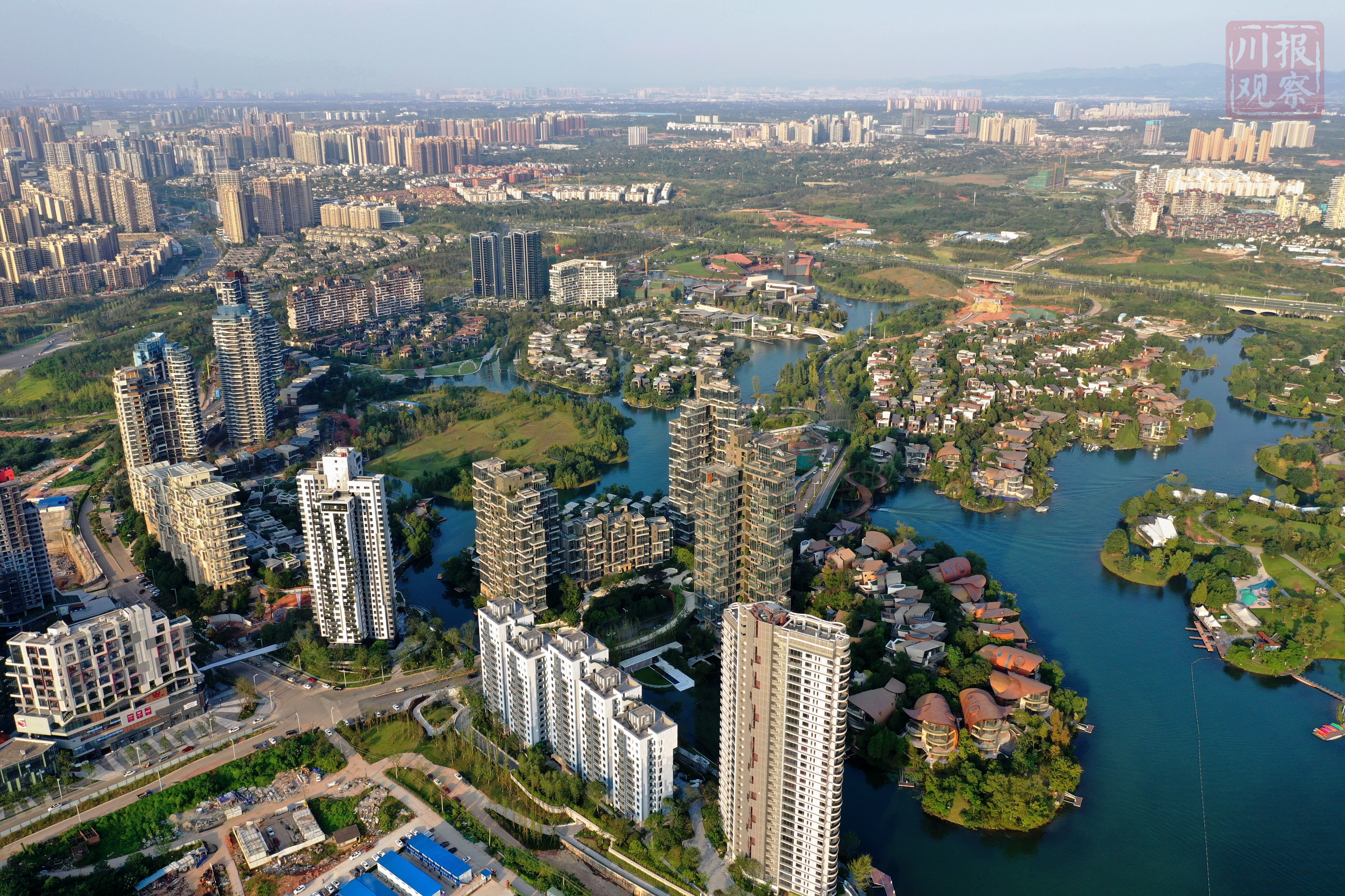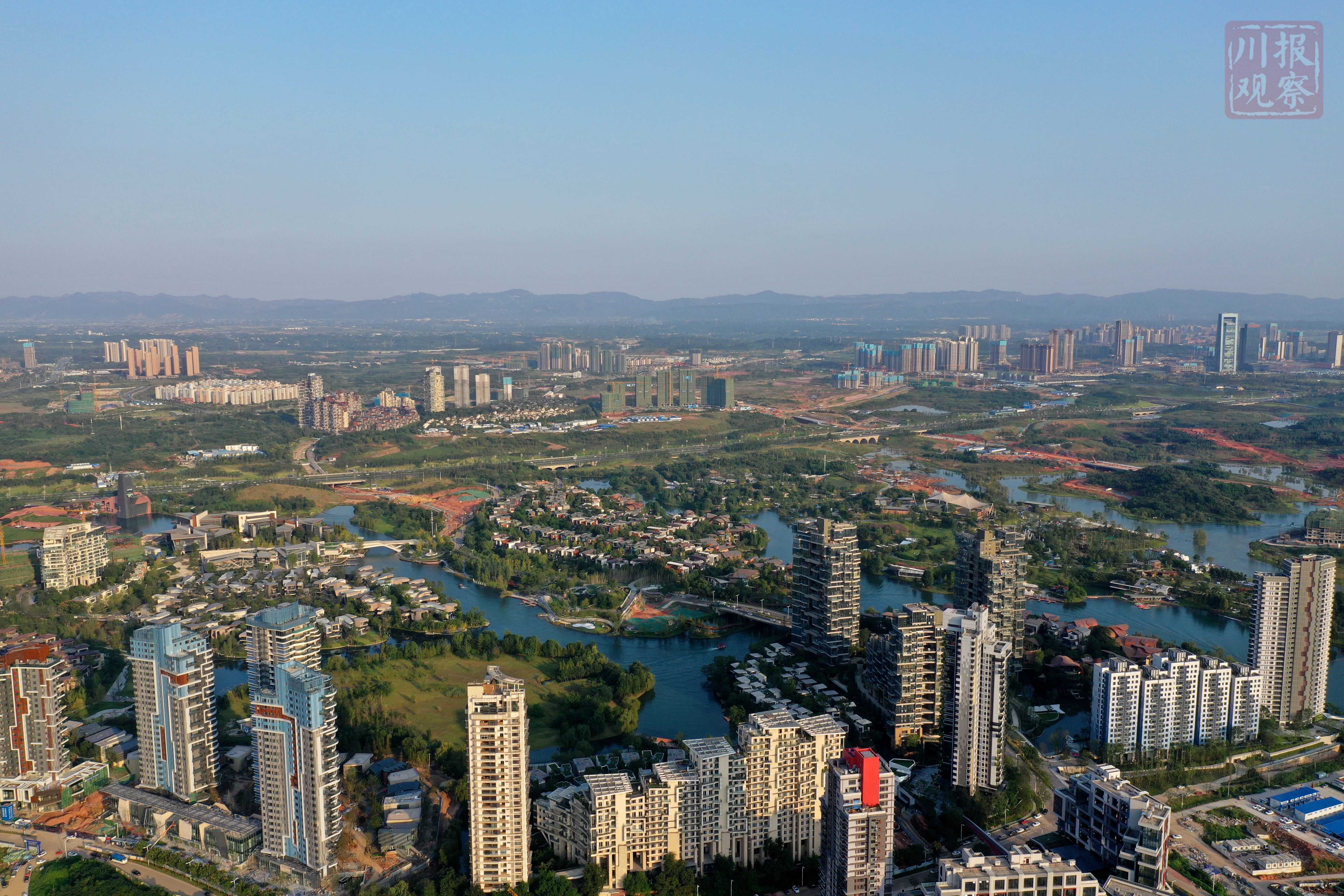 俯瞰成都天府新区,只见一栋栋高楼拔地而起,一条条大道联通四方,一处处公园游人如织,远处的龙泉山脉肉眼可见,在晚霞的照耀下美轮美奂!(川报观察记者 李向雨)