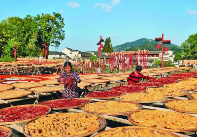 9月22日,村民在安徽黄山徽州区呈坎古村晒场上晾晒五颜六色的农作物。施广德摄/光明图片