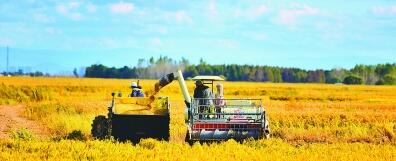 9月21日,黑龙江省哈尔滨市通河县富林乡五合水稻联合社种植基地的水稻开镰收割,田间地头一派繁忙景象。光明网记者 郝魁府摄/光明图片