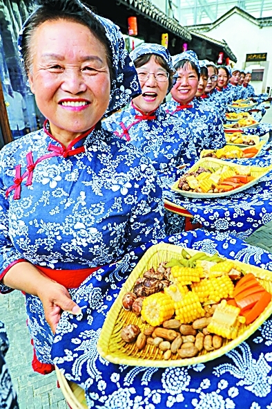 9月23日,在上海市金山区廊下生态园举行的丰收节活动上,村民展示供游人品尝的食物。新华社发(庄毅摄)