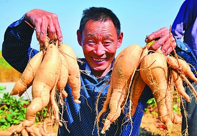 9月22日,山东省枣庄市山亭区店子镇柳泉村农民在展示收获的红薯。新华社发(刘明祥摄)
