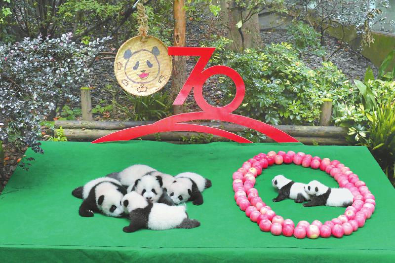 工作人员正将7只新生大熊猫宝宝摆成“7”字,和旁边的苹果组成“70”,为新中国成立70周年送上美好祝愿。 本报记者 郝飞 摄